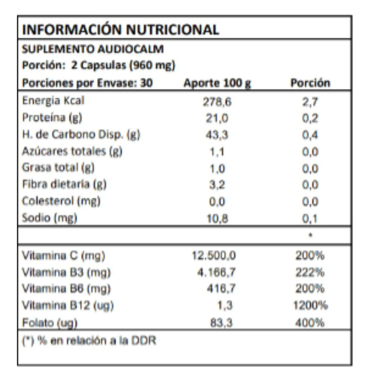 AudioCalm - Alivio Natural para el Tinnitus ¿Escuchas sonidos o pitidos que solo tú puedes captar?Recupera tu tranquilidad auditiva con Audio Calm, el suplemento 100% natural desarrollado en laboratorios internacionales para proporcionar alivio efectivo contra los zumbidos y molestias otológicas. Formulado específicamente para quienes padecen tinnitus también conocidos como acúfenos. Este tratamiento actúa relajando el sistema nervioso, reduciendo la ansiedad y devolviéndote el equilibrio necesario para recuperar tu vida normal sin sonidos molestos.Características DestacadasAlivio específico para acúfenos: Su fórmula de origen natural está diseñada para reducir progresivamente la percepción de zumbidos y sonidos internos en los oídos, proporcionando un alivio tangible que mejora la calidad de vida y la concentración en actividades diarias sin molestias constantes.Relajación del sistema nervioso central: Componentes activos seleccionados trabajan sobre el sistema nervioso para disminuir los niveles de ansiedad y estrés asociados a los acúfenos, mejorando el estado de ánimo general y reduciendo la intensidad percibida de los síntomas a través de un enfoque holístico.Desarrollo internacional con ingredientes naturales: Formulado en laboratorios de alto estándar que garantizan la pureza y eficacia de los componentes, ofreciendo una alternativa confiable y segura libre de efectos secundarios para el manejo de molestias otológicas crónicas.Restauración del equilibrio y bienestar: Más allá del alivio sintomático, contribuye a recuperar el equilibrio personal y la paz interior, permitiendo retomar actividades normales sin la interferencia constante de sonidos que alteran la concentración y el descanso adecuado.Especificaciones técnicas:Duración: 1 mesTipo de producto: Suplemento alimentarioPresentación: Frasco con 60 cápsulasModo de uso: 2 cápsulas al día.Sabor: Neutro/Sin saborCaracterísticas: Origen NaturalPaís de origen: ChileSEREMI de Salud R.M. N° 201365816 del 26/03/2020